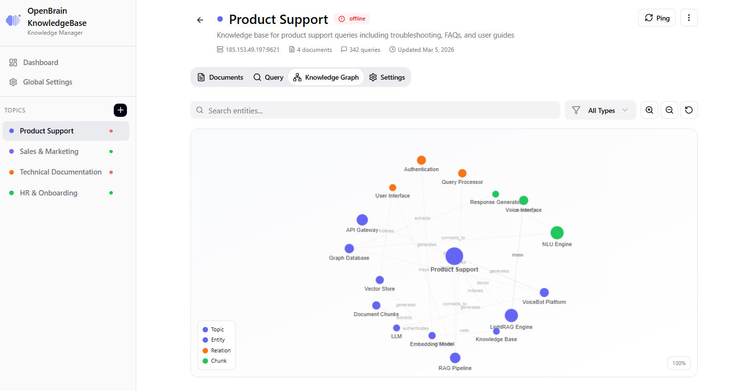 OpenBrain supports both open-source and proprietary large language models, including on-premise deployments for organizations that require stronger privacy, lower latency, or domain-specific customization. It also includes model management workflows for adapting and selecting the right models for each use case.
